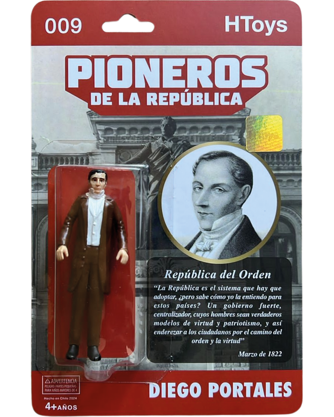 Figura coleccionable y juguete de Diego Portales en 3D. Incluye una breve biografía y una reseña de su vida, obra y legado como Pionero de la República.